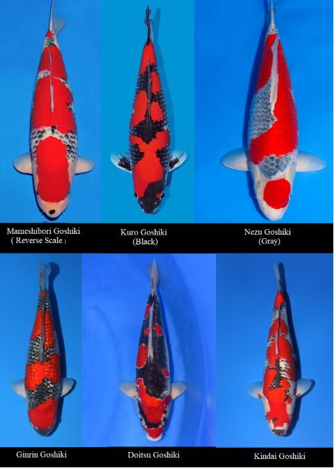 Đặc điểm: Goshiki (tên tiếng Nhật: 五色 – nghĩa là “năm màu”), trong tiếng Nhật có nghĩa là “ngũ sắc” – đại diện cho 5 màu: đen, xanh lam, xám, trắng và đỏ. Dòng cá này được lai tạo lần đầu tiên vào năm 1918, là kết quả của việc lai giữa Kohaku (đỏ-trắng) và Asagi (xanh lưới bạc).
