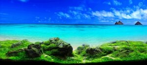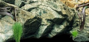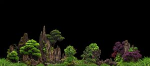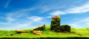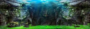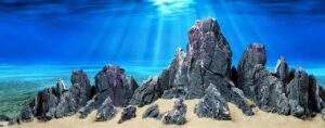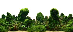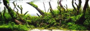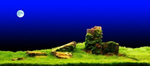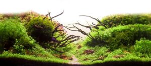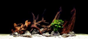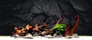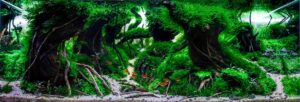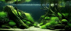 A captivating nature aquarium illustration with underwater plants, driftwood, rocks, and fish, showcasing a harmonious aquascape design. Generative AI
