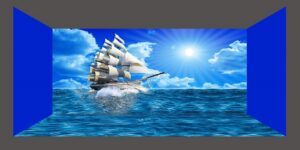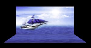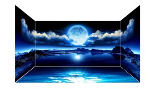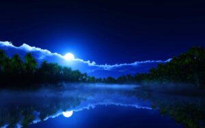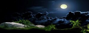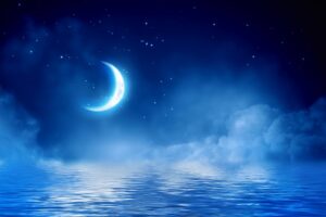 Night sky with full moon in the clouds and reflection in the sea - Deep blue moonlit "Elements of this image furnished by NASA; Shutterstock ID 1055250878; purchase_order: -; job: -; client: -; other: -